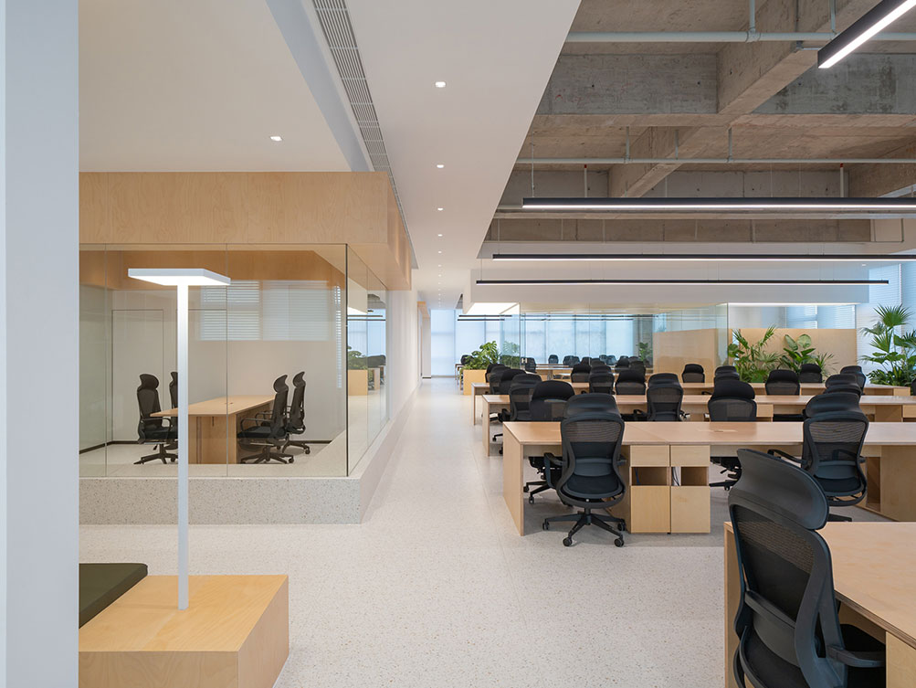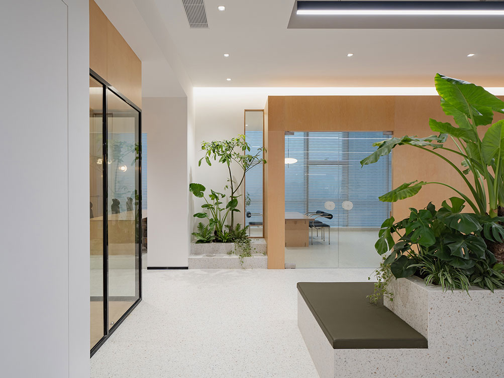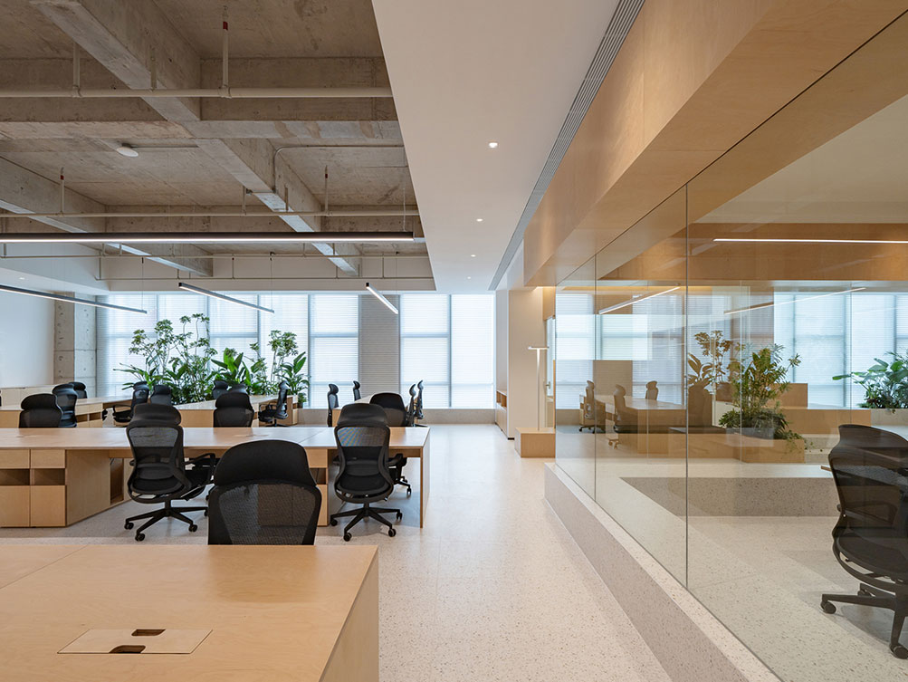 濟南辦公室裝修中傲思拓辦公室以自然共生為核,工業風清水混凝土頂搭配溫潤樺木,玻璃隔斷保障通透。開放區原木長桌適配協作,落地窗引自然光,綠植消解冷感,半開放休閑區兼顧多元場景,既保留空間肌理,又以自然元素營造松弛高效的辦公場域。