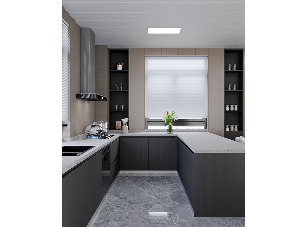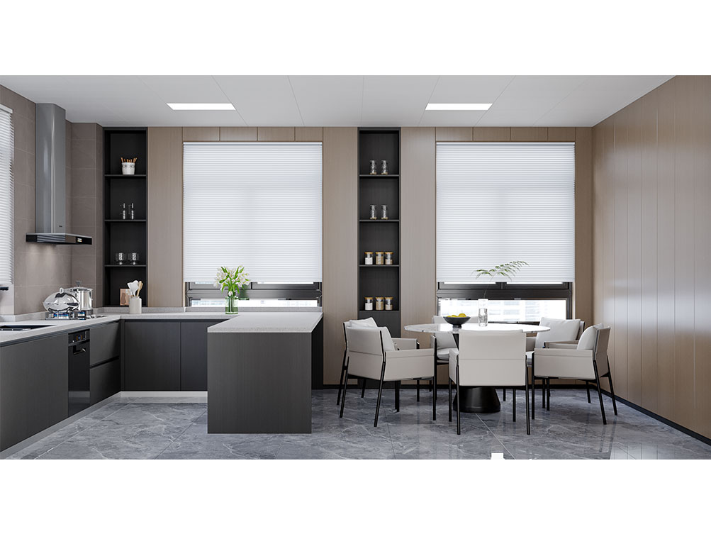 作為濟南辦公室裝修中兼具實用與質感的案例,博納辦公室餐廚區以淺灰大理石圓桌搭配柔米色座椅,適配員工輕食、交流場景。淺灰通體磚 + 百葉窗保障通透明亮,嵌入式柜體與金屬線條點綴輕奢感,契合濟南辦公室裝修功能化休閑空間的設計趨勢,是濟南商務辦公場域中舒適化配套的典型呈現。