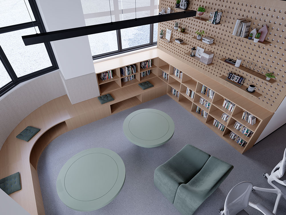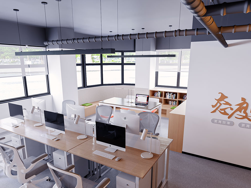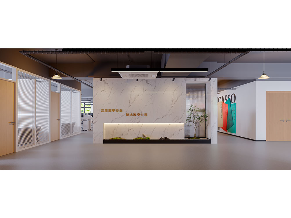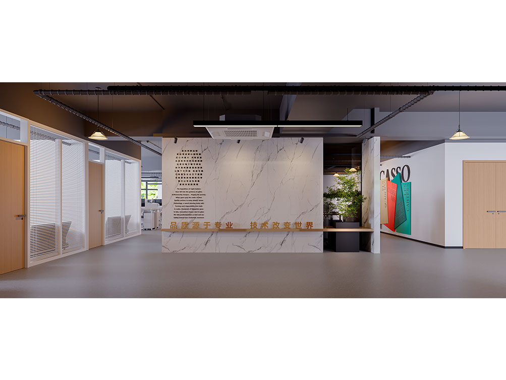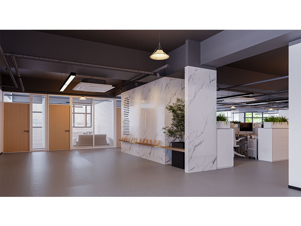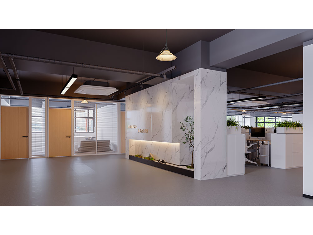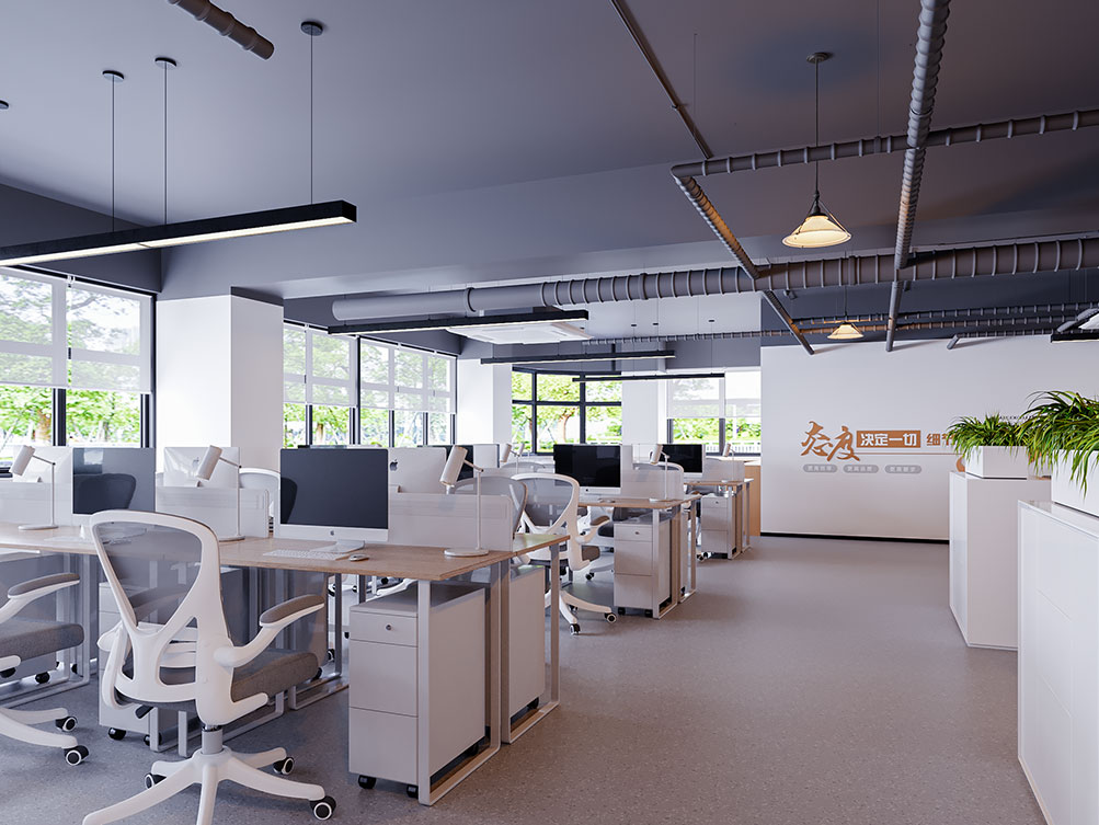 設計理念: 作為濟南辦公室裝修中年輕化辦公空間的代表,博納生物二樓以裸露管道 + 深灰頂的工業肌理打底,搭配白調柜體與原木色工位,平衡冷硬與柔和。白色花箱綠植穿插其間,墻面創意裝飾注入活力,契合濟南辦公室裝修 “功能 + 美學” 的設計需求,是濟南科創企業辦公空間的個性范本。