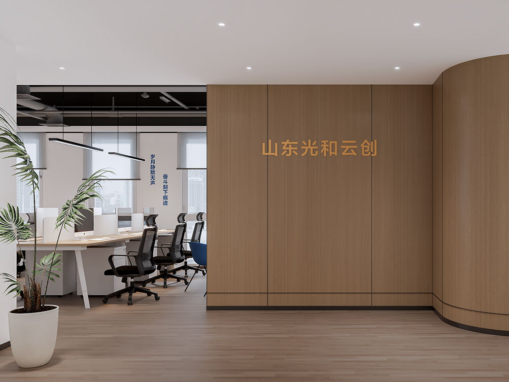 作為濟南辦公室裝修中科創類空間的代表,光和云創辦公室以工業風裸頂和淺木色地板打底,搭配簡約工位與人體工學椅,適配團隊協作。墻面標語注入品牌精神,大窗引自然光綠植點綴,平衡辦公效率與舒適感,是濟南辦公室裝修中的典型案例。
